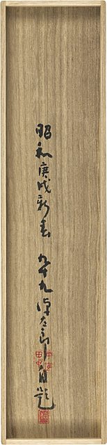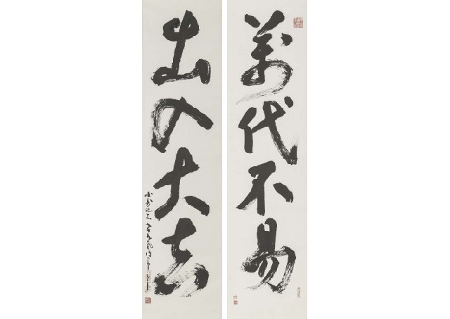 - each ink on paper, sealed, signed on 1 piece, each mounted for a scroll, each paper size 136x34.4cm, each total size 210.8x52.8cm, with tomobako(the box signed by the artist).