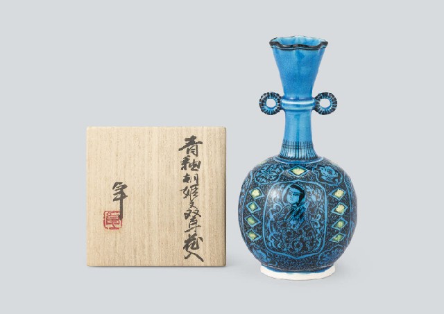 [Lot0486] Vase with design of princess in blue glaze with lugs