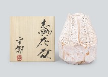 - "Cylindrical vase with carved design in white glaze"/H25xW8.8cm, marked underneath, "Bowl with carved design"/H12.6xW26.7cm, marked inside the foot-ring, each with tomobako(the box signed by the artist).