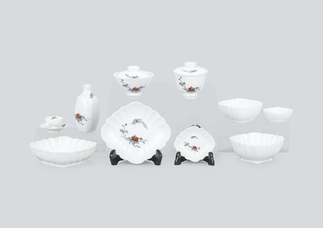 - a set of 102 including 30 plates, 30 bowls, 18 lidded bowls, 5 sake decanters, 9 sake cups and 10 sake cup stands, each marked, with tomobako(the box signed by the artist), with a certificate, Only a portion is shown in the photo.