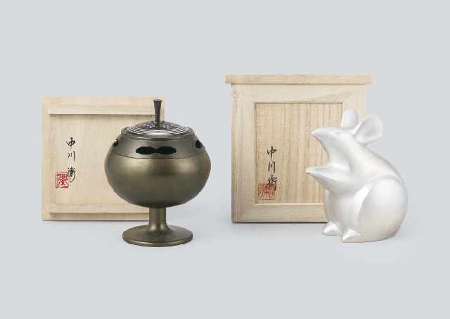 - "Silver inlaid incense burner with design of flower"/H13xW9.5cm, incised underneath, "Silver mouse ornament"/H10.6xW10.3x6.7cm, incised underneath, each with a box.