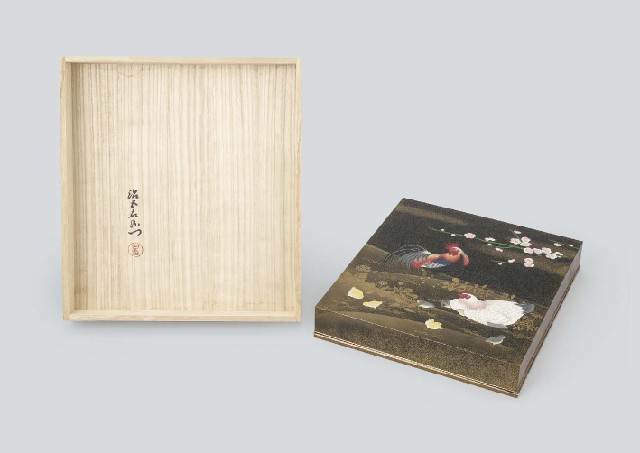 [Lot0786] Covered box with design of rooster and plants in maki-e lacquer