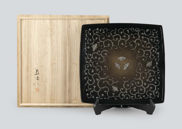 - Square tray with design of butterfly and arabesque in maki-e lacquer