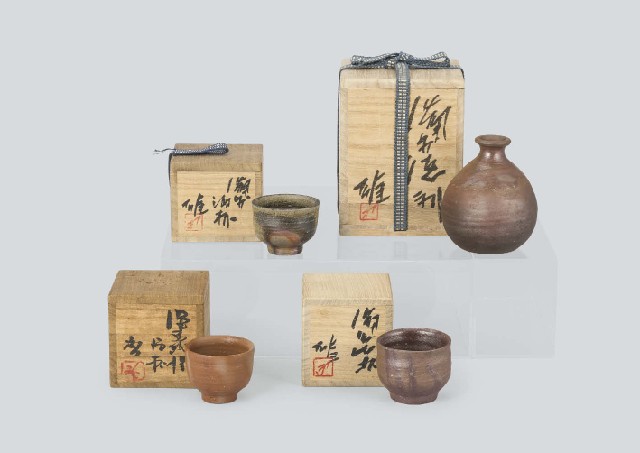 - FUJIWARA Kei "Bizen sake cup with fire marks"/H5.1xW6.4cm, marked at the side of the foot-ring, FUJIWARA Yu "Bizen sake cup (a set of 2)"/LEFT:H5xW6.7cm, marked at the side of the foot-ring, RIGHT:H5.6xW6.8cm, marked at the side of the foot-ring, FUJIWARA Yu "Bizen sake decanter"/H10.9xW9.4cm, marked on the side, each with tomobako(the box signed by the artist).