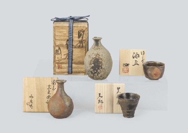 - YAMAMOTO Toshu "Bizen yohen sake decanter"/H11.7xW8.2cm, marked underneath, HARADA Juroku "Bizen sake decanter"/H13.8xW9.5cm, marked underneath, ISEZAKI Koichiro "Black sake cup"/H6.9xW7.4cm, marked underneath, URAKAMI Zenji "Bizen sake cup"/H5.4xW7.5cm, marked at the side of the foot-ring, each with tomobako(the box signed by the artist).