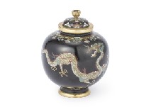 - Small lidded jar with design of chrysanthemum in cloisonne