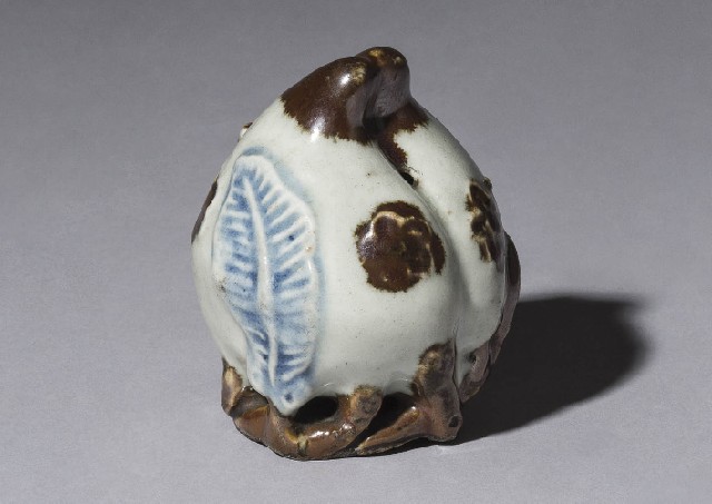 - Joseon dynasty blue and white porcelain peach shaped water dropper in underglaze iron brown