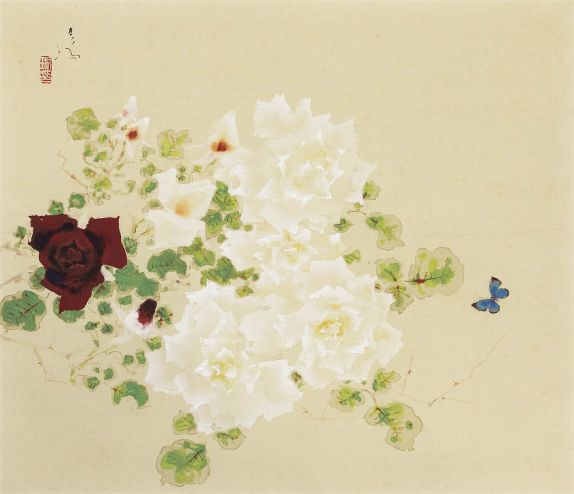 ink and color on silk, 42.8x49.3cm, signed and sealed, mounted for scroll, with a wooden box signed by the artist.