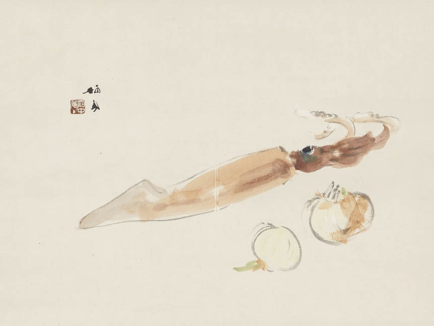 ink and color on paper, 35x46.8cm, signed and sealed, mounted for scroll, with a wooden box signed by the artist.