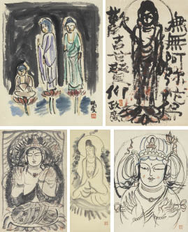 this lot accompanies other works; 【Namu Amida Butsu】(ink and color on paper, 85.8x55.5cm, signed and sealed, mounted for scroll, with a wooden box signed by the artist)【Kannon】(ink and color on paper, 86.5x56.4cm, sealed, mounted for scroll, with a wooden box signed by the artist)【Kannon】(ink and color on paper, 73x28.8cm, sealed, mounted for scroll, with a box)【Kannon】(ink and color on paper, 72.5x52.5cm, sealed, mounted for scroll, with a box).Condition : pale toning and some stains at the image; 【Namu Amida Butsu】: pale toning, scattered stains, some minor creases and paper loss at the image; 【Kannon】: toning, scattered stains, some creases, paper loss and restoration at the image; 【Kannon】: pale toning and some stains at the image; 【Kannon】: pale toning, some stains and creases at the image.