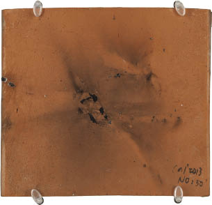 2013, gunpowder on ceramic, 22.5x25.5cm, signed, also signed on verso, framed.