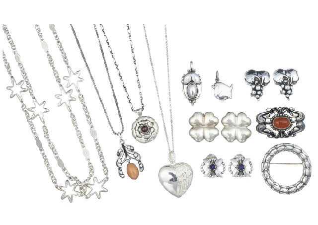 - 1 Long Necklaces (inscription: 925S), 3 Pendants (all inscription: 925S, 2 items: GEORG JENSEN top part), 2 Pendants (both inscription: 925S), 3 Ear Clips (all inscription: 925S), 2 Brooches (both inscription: 925S),
