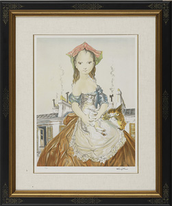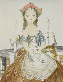 【Lot0069】 パリの屋根の前の少女と猫(エスタンプ)
