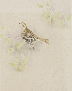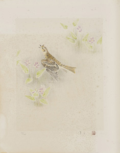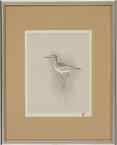 ■備考:(作品)「雲雀(春)」「鴫(夏)」「尉鶲(秋)」「瑠璃鶲(冬)」の4枚1組 「鴫(夏)」は額装済 「雲雀(春)」の作品全体に水ジミ、変色、シミ多数など状態に難有 他3点は概ね良好