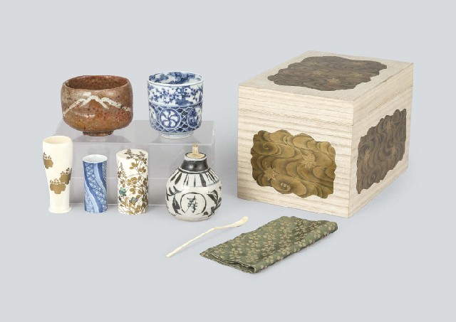 H14.7×W15.1×21.4cm 箱付 赤茶碗(高台脇に描き銘「左入作」「休」 直し)、染付筒茶碗(高台内に描き銘「五郎太夫呉祥瑞造」)、象牙中次(螺鈿にハガレ)、象牙茶杓、振出(底部に描き銘「半七」)、象牙茶筅筒、茶巾筒、古袱紗付