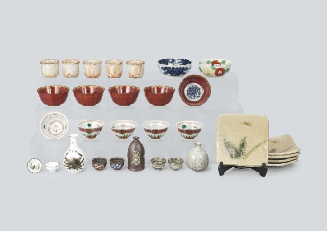 - 光春窯「北大路魯山人美食俱楽部酒器揃(3点1組)」、祥窯「北大路魯山人美食俱楽部酒器揃(3点1組)」、矢筈窯「北大路魯山人美食俱楽部酒器揃(3点1組)」、祥山「魯山人美食道楽和食器揃(四方皿 5点1組)」、小泉蔵珍「魯山人冩赤繪向付(5点1組)」、祥山「魯山人美食道楽和食器揃(向付 5点1組)」、「魯山人美食道楽和食器揃(筒向 5点1組)」、不詳「魯山人写しの器(鉢 2点1組)」の計8組セット 各在銘 8組とも箱付