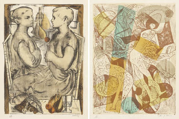 小磯良平、猪熊弦一郎、脇田和、北川民次(名古屋日動画廊No.57)他11名によるリトグラフ11枚が収められた版画集 63.5×45.1~45×64.2(シート)cm ed.100 全てにサイン、ed. 12枚1組のうち岡鹿之助1枚欠落 総ed.100部より巻頭にed.の記述 明治書房刊 いずれもシート所々にシミ 数枚のシート全体に薄いヤケ、数ヶ所にシワ、ヨゴレ 1枚の裏面所々にヤケ オリジナルケース付