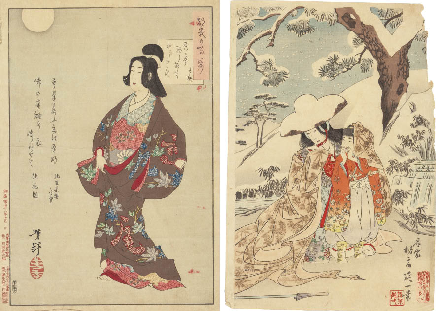 楊洲周延、月岡芳年、渓斎英泉、礒田湖龍斎他多作家による浮世絵27枚セット(続物数組含む) 木版 37×25.2(シート)~73.7×24.8(全体)cm 数枚に落款と印共に版上 数枚に版上落款 ※詳しいコンディションについてはお問い合わせください。 3点額付