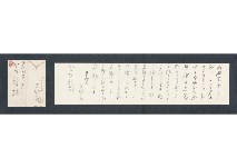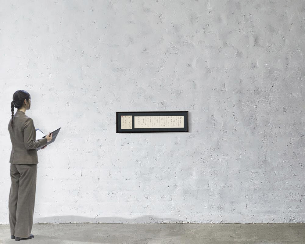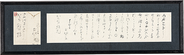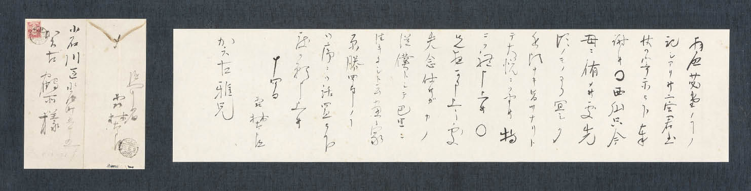 賀古鶴所宛書簡、別の書簡に使用した封筒の2点を額装した作品 紙に墨 18.3×76.8cm/20.5×16.7cm 各落款有 いずれも画面全体に薄いヤケ、数ヶ所にシミ 額付