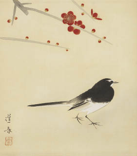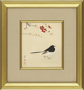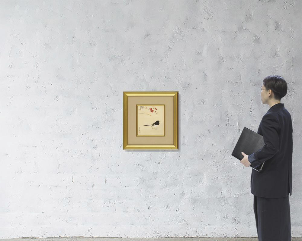 絹本色紙に彩色 27×24(色紙)cm 落款と印有 画面全体にヤケ、数ヶ所に小さなシミ 共箱 額付