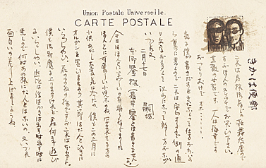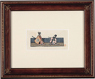 葉書に水彩 9.1×14(葉書)cm 印有 紙裏にサイン、ペンによるドローイング 画面全体に薄いヤケ、数ヶ所にシミ、わずかなヨゴレ、縁沿い数ヶ所にわずかなメクレ、2ヶ所にシワ 額付