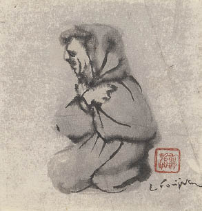 紙に墨 10.9×12.1(紙)cm サインと印有 画面全体に薄いヤケ、数ヶ所に小さなシミ、シワ 額付