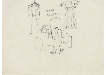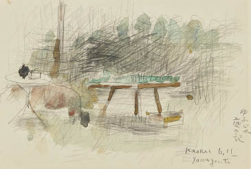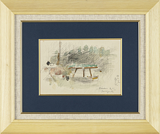 紙に鉛筆・水彩 20.5×30(紙)cm サイン有 スケッチブックに描かれた作品 画面全体にヤケ、数ヶ所にシミ、シワ 額付