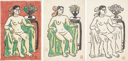 木版・合羽摺2枚、木版1枚の3枚セット エディトリアルさあかすNo.6、7を含む 32.3×24.5(各シート)cm ed.EA 全てに印、ed. 全て平塚運一による刷り いずれもシート全体にヤケ、数ヶ所にシミ、シワ、マージン縁沿い数ヶ所にわずかなヤブレ 1枚のマージン数ヶ所に穴
