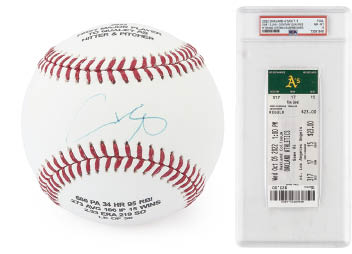 もう1点は【2022年投打規定数達成試合チケット】(「2022 OAKLAND A'S/OCT. 5 OAK-3.LAA-2/OHTANI QUALIFIES PITCHING, HITTING LEADERBOARDS」 鑑定済[PSA8])