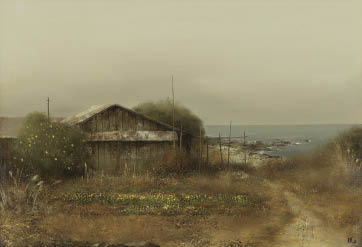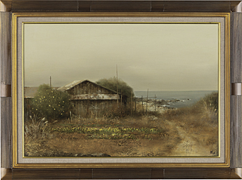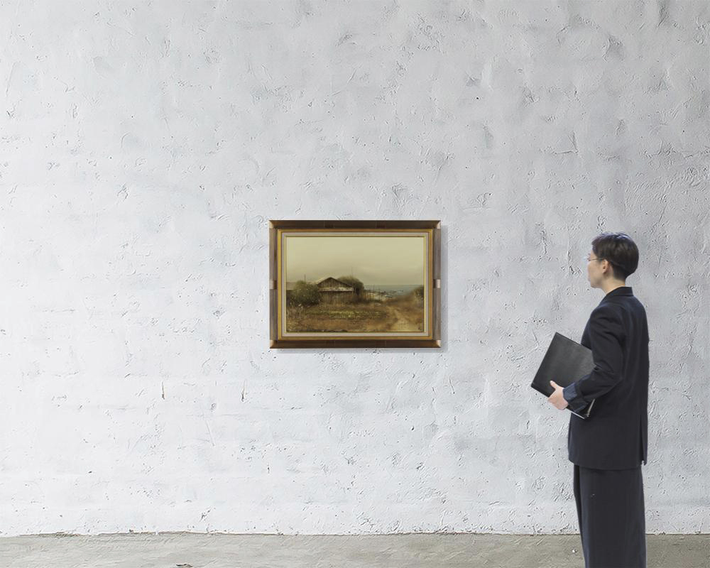 キャンバスに油彩 M20号 サイン有 「個展」(三越、1985年)出展作品シール 画面数ヶ所に浅いヒビ 額付