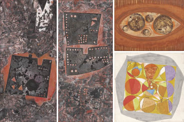 パネルに貼付した紙にミックストメディア 24.2×24.2~45.5×21.5cm いずれも画面数ヶ所にヒビ、剥落 2点の画面2ヶ所にヤブレ 1点の画面数ヶ所にわずかなキズ 2点額付