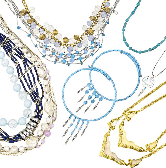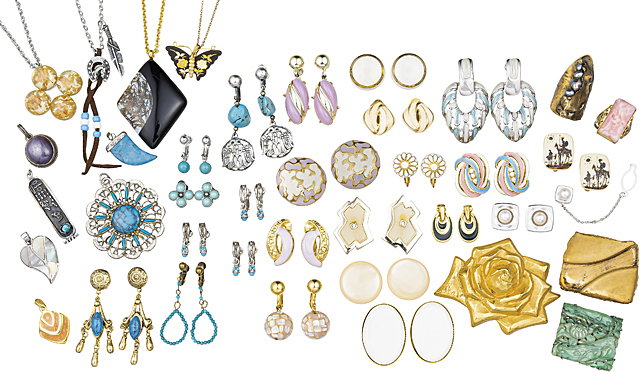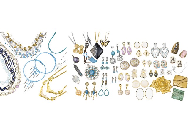 ロングネックレス3点、ネックレス10点、ペンダント4点、ペンダントトップ6点、イヤリング21点、ブローチ1点、リング2点、カフス2点、タイタック1点、帯留2点