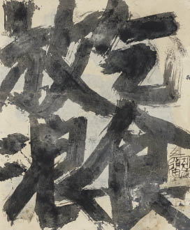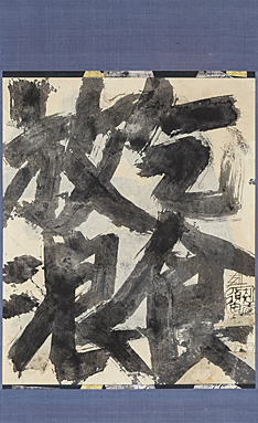 1989年 紙に墨・コラージュ 80×66cm サインと印有 軸装 画面全体に薄いヤケ、数ヶ所にシミ、シワ、1ヶ所にコラージュのメクレ 箱付