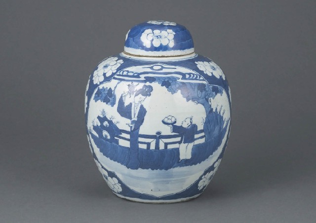【Lot1003】 染付梅花窓絵人物文蓋付壷