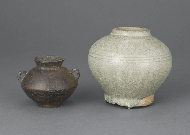 卵殻黒陶双耳小壷・青磁陰刻蓮弁文壷 [2点セット]