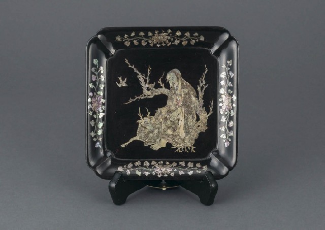 【Lot1041】 螺鈿寿老人文入隅四方盆