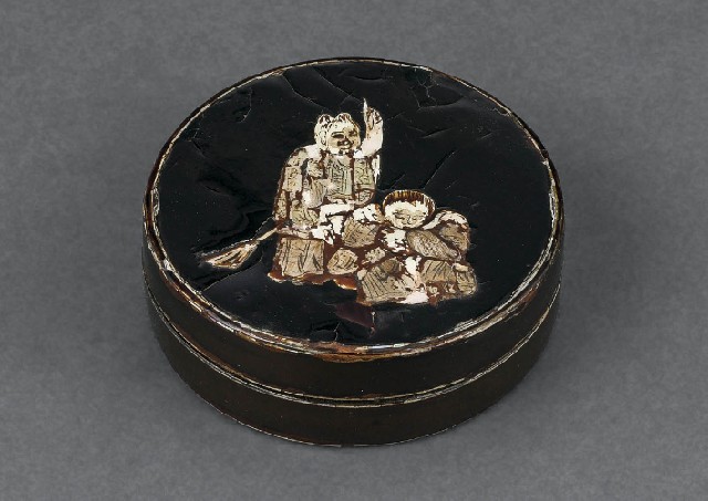 【Lot1045】 唐物青貝内朱寒山拾得文香合