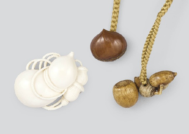 八川秀方「象牙瓢箪帯留」/W5.8×4.1cm 裏面に刻銘「秀方」 共箱 宮澤良舟「象牙栗根付」/H2.6×W2.9×1.3cm 底部に刻銘「良舟」 箱無 同「象牙団栗根付」/H2.2×W5.1×2.1cm 側底部に刻銘「良舟」 箱無
