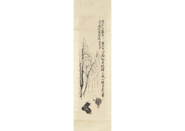 紙に墨 落款と印有 軸装 128.5×33(紙)cm 全体/198×58cm 折れ、シミ