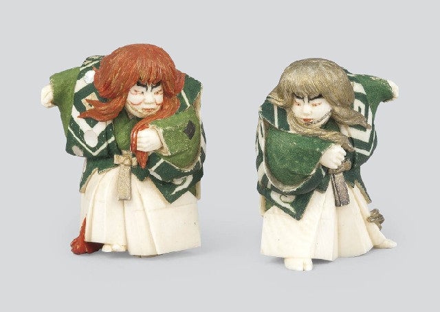 各象牙に彩色 H5.2×W4.2×3(各)cm 各底部に刻銘「一郎」 共箱 参考文献:会田雄次他著 「根つけと私・江戸の粋」(講談社刊 1977年)に同手作品掲載