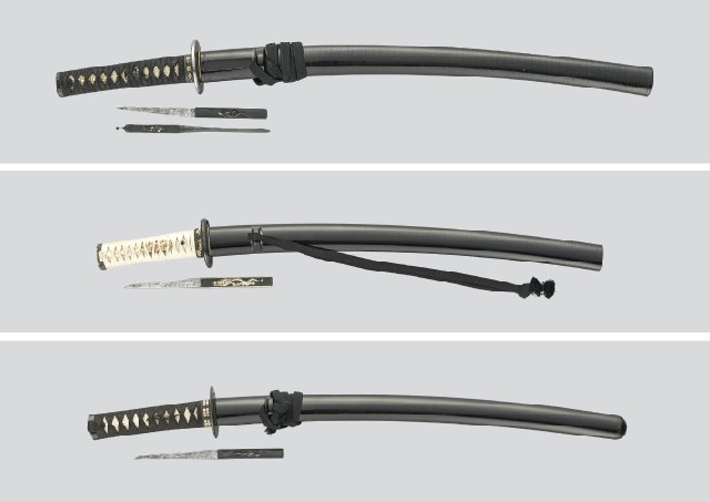 黒漆笛巻塗鞘脇差拵(2点)/上:全長約77cm 小刀穂に在銘「井上真改」 下:全長約67cm 小刀穂に在銘「山口主水正清作」 直し 黒漆塗鞘脇差拵/全長約74cm 小刀穂に在銘「山城守入道是一」