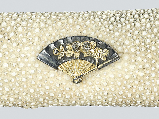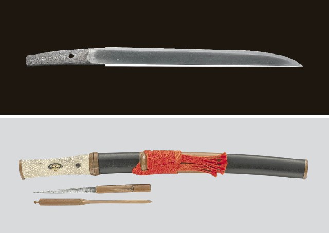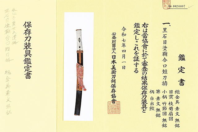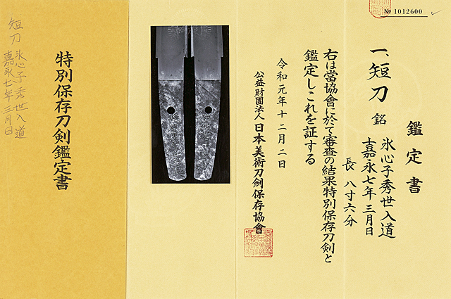 - 刀身/刃長26.0cm 元幅2.5cm 銘「氷心子秀世入道/嘉永七年三月日」 日本美術刀剣保存協会特別保存刀剣鑑定書(令和元年) 銃砲刀剣類登録証 白鞘入 拵/全長約49.8cm 総金具:素文 目貫:枝菊扇図 小柄:竹節図 笄:素文 柄:白出鮫 小刀穂に在銘「関金重」 日本美術刀剣保存協会保存刀装具鑑定書(令和7年)