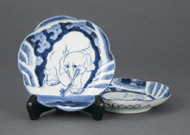 【Lot0473】 伊万里染付象文輪花皿(2点)