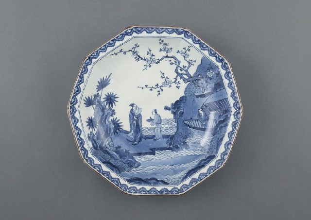 【Lot0481】 古伊万里染付人物文十角面取鉢