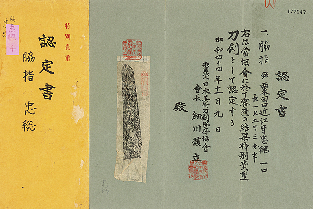 刀身/刃長46.3cm 反り0.6cm 元幅2.8cm 先幅1.9cm 銘「粟田口近江守忠綱」 日本美術刀剣保存協会特別貴重刀剣認定書(昭和44年) 銃砲刀剣類登録証 白鞘入