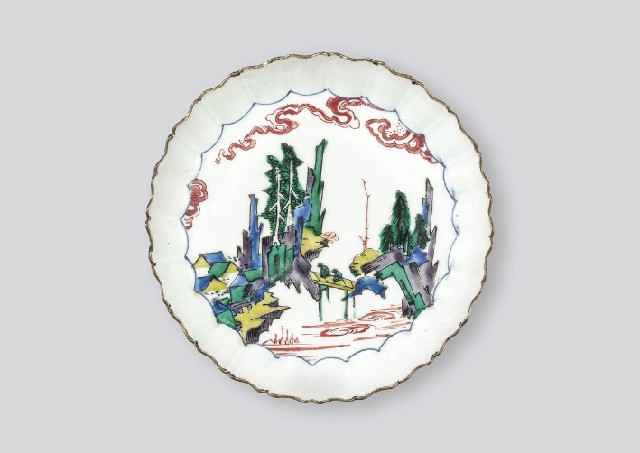 【Lot0536】 古九谷色絵山水人物文輪花皿