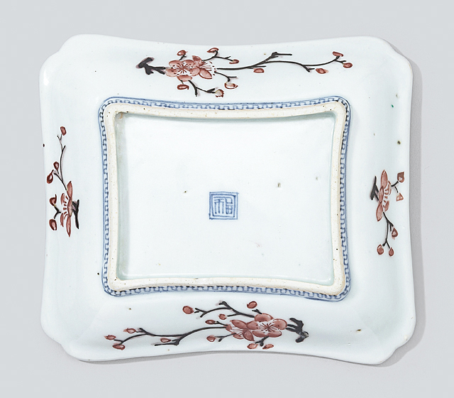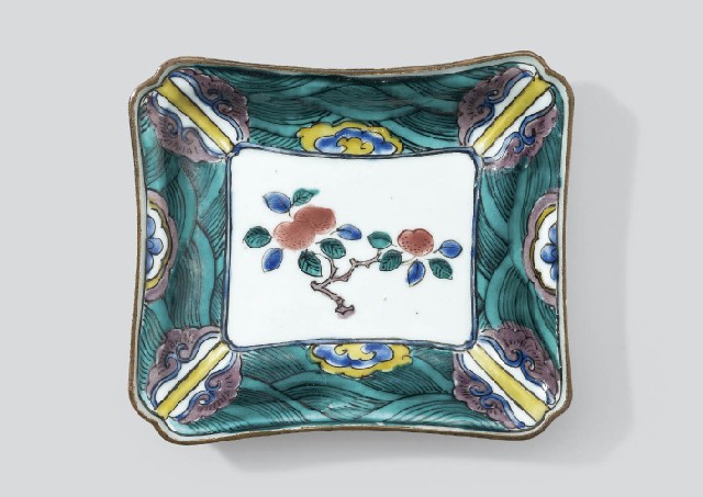 【Lot0538】 古九谷色絵桃文四方入隅皿