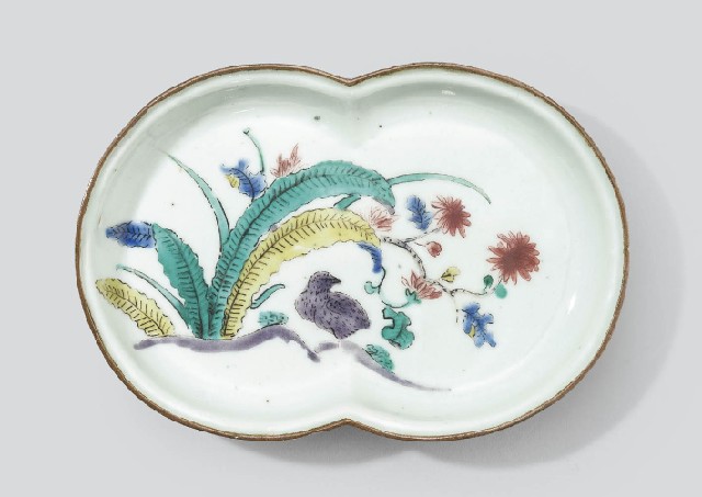 【Lot0539】 古九谷色絵芭蕉鶉文変形皿