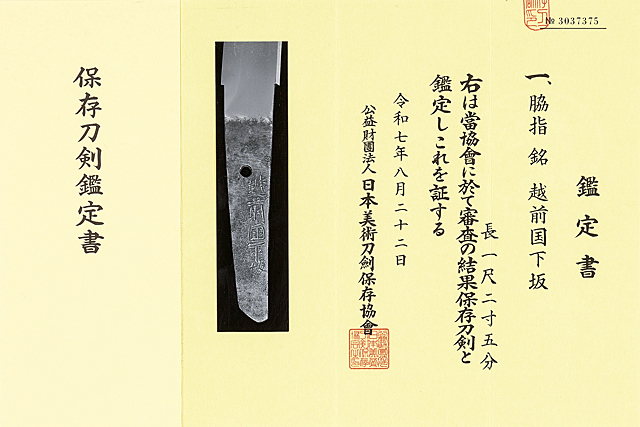 刀身/刃長37.8cm 反り1.0cm 元幅3.3cm 銘「越前国下坂」 日本美術刀剣保存協会保存刀剣鑑定書(令和7年) 銃砲刀剣類登録証 白鞘入