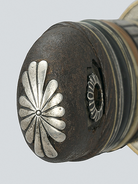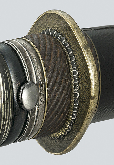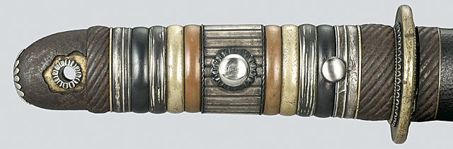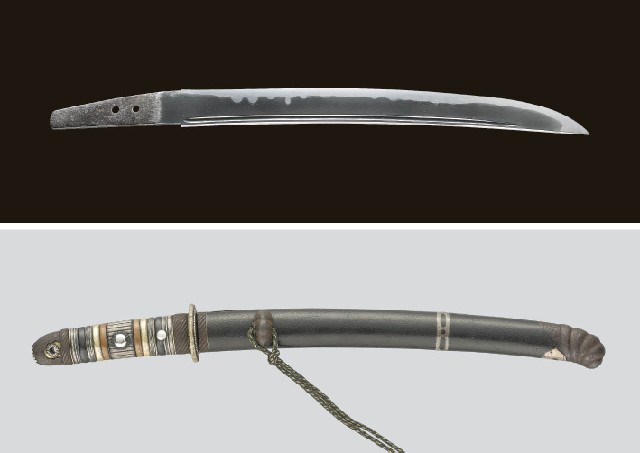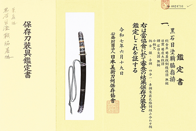 刀身/刃長33.2cm 反り0.6cm 元幅3.0cm 銘「兼房」 銃砲刀剣類登録証 白鞘無 拵/全長約57cm 総金具:菊菱紋刻模様図 目貫:菊座丸紋図 鐔:石目文図 柄:金・銀・赤銅・四分一・素銅象嵌色絵刻組み合わせ柄 小柄欠 日本美術刀剣保存協会保存刀装具鑑定書(令和7年)